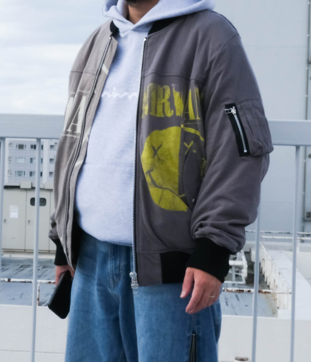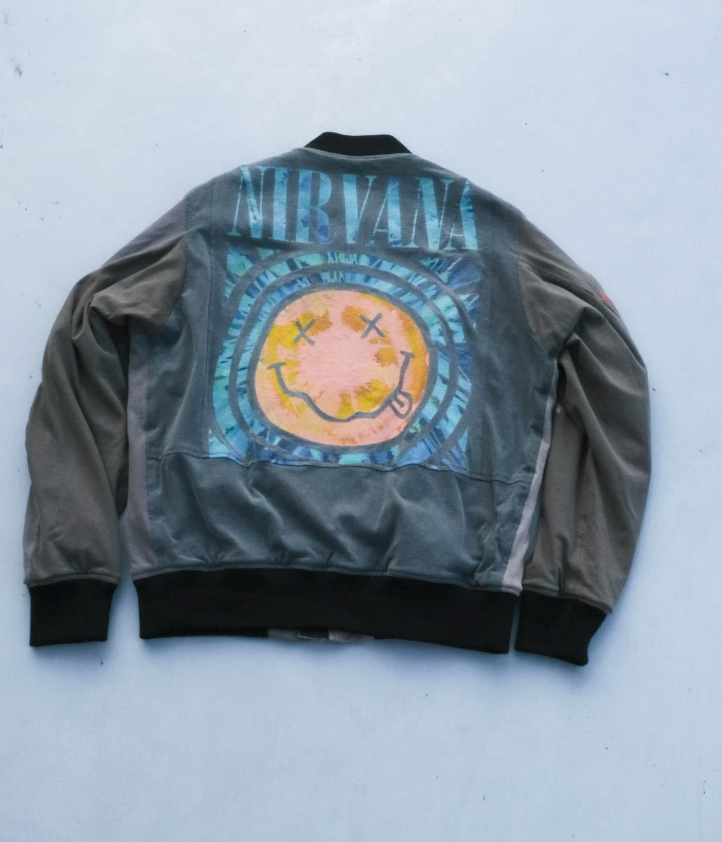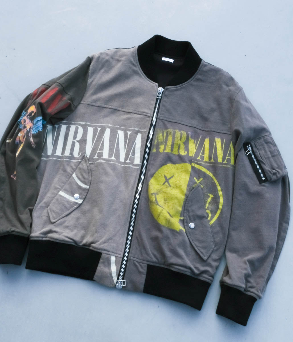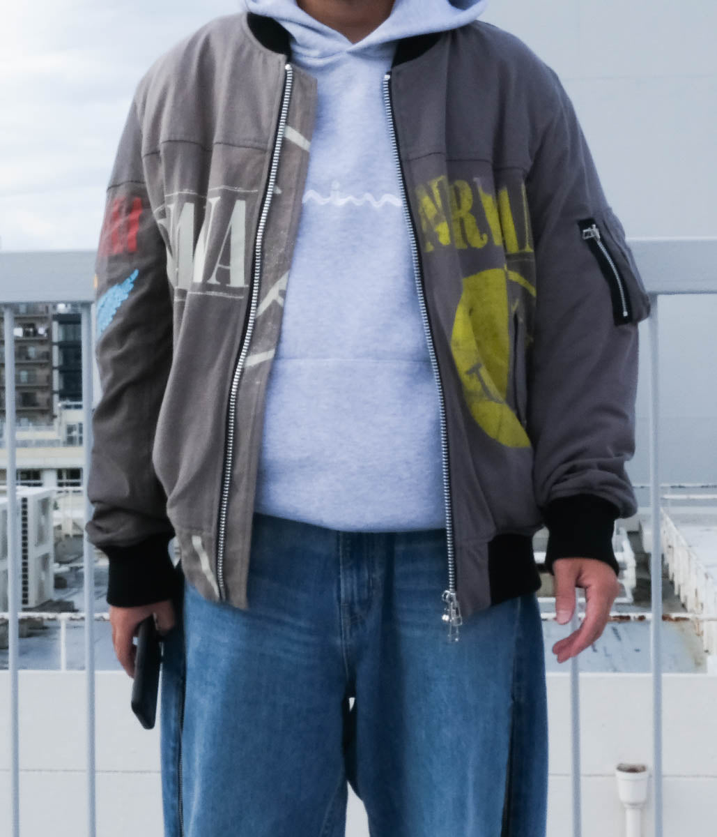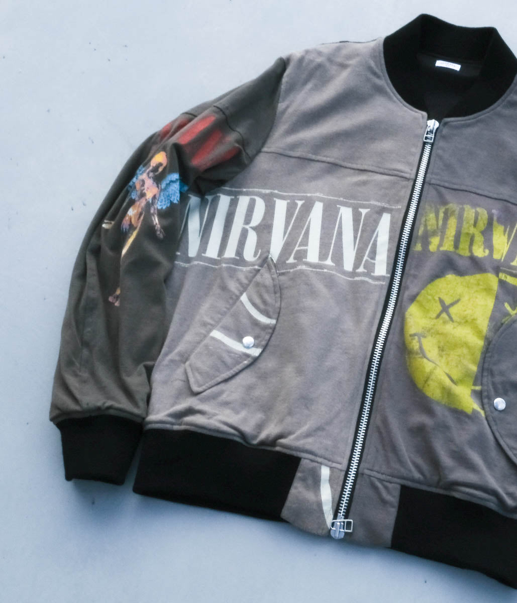 古着のTシャツを一度解体し、パッチワークデザインで再構築されたフライトジャケット。